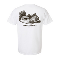 Our classic heavyweight pocket tee is built for comfort and everyday wear with a timeless unisex fit. In white, this tee features the iconic Dexter Cider Mill logo on the front pocket and a detailed sketch of the historic cider mill building on the back.